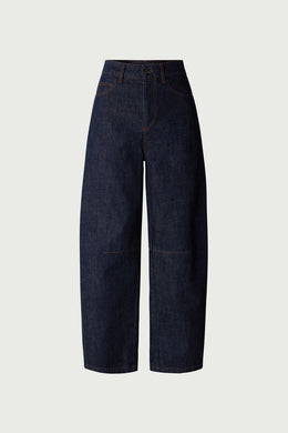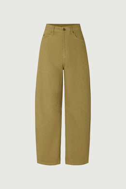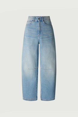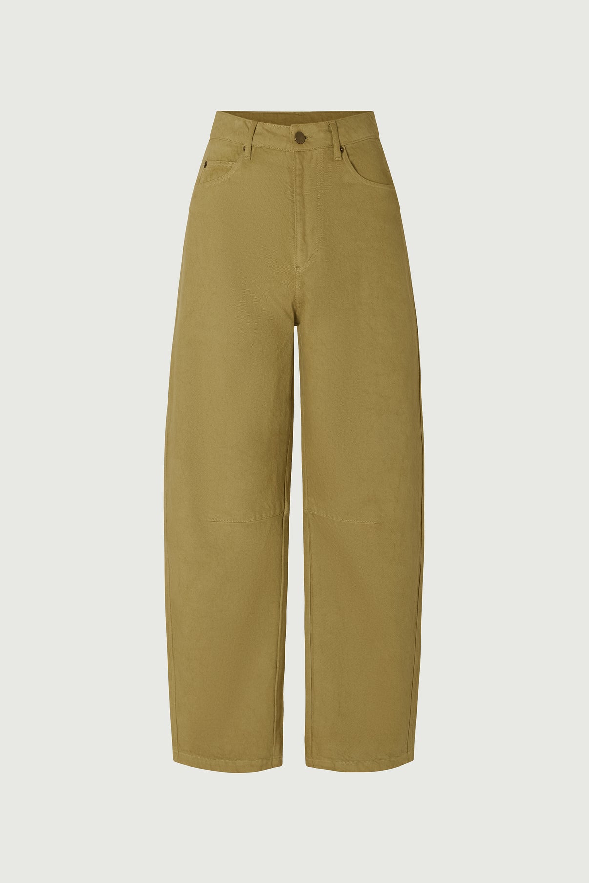 ELIOTT are wide-leg trousers in embossed denim with a feminine cut. The curved leg design slims the waist, while the light beige shade offers a style that combines casual and elegance.