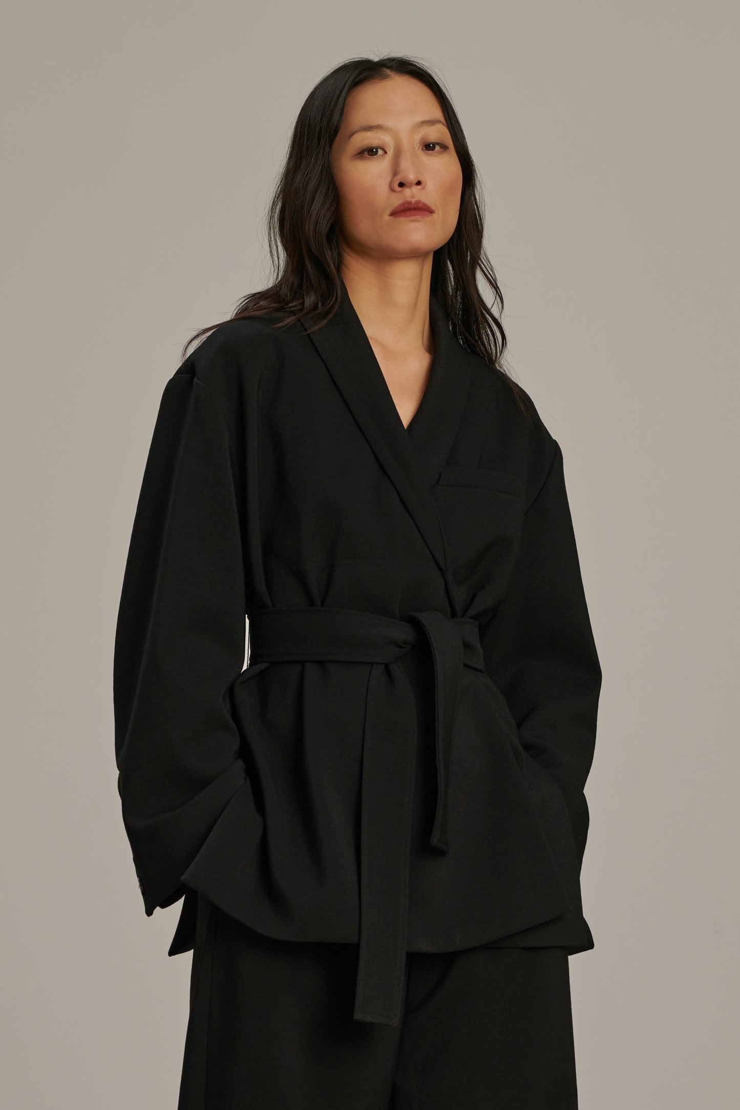 COME is a jacket made from lightweight grain de poudre in a new style. With a relaxed "dressing gown" cut, it's elevated by the use of an elegant fabric.